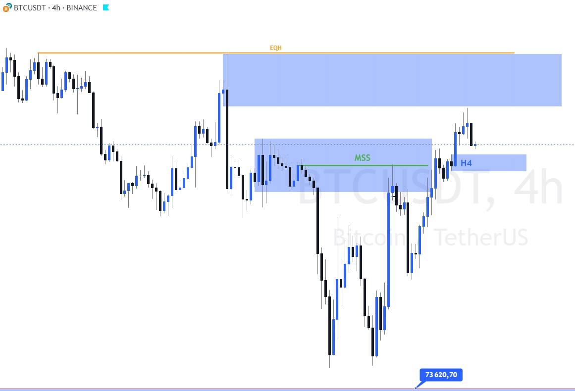 - Je considère toujours un scénario avec une baisse dans un premier temps jusqu’au 73620$. Je vais surveiller le retour du prix dans le POI H4 et surveiller une confirmation en M8 voir si une belle distribution se met en place pour une possible entrée si c’est le cas.